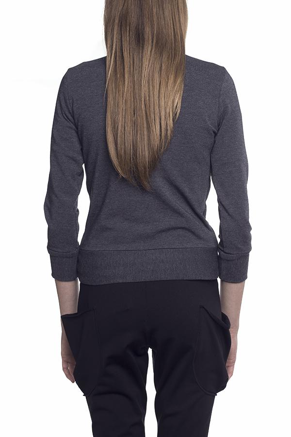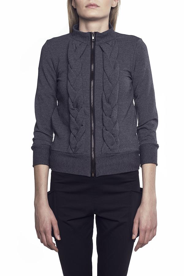 Bluza w kolorze jeasnu lub szarego melanżu, dopasowana, z rękawem 3/4. Bardzo kobieca z ręcznie wykonanymi warkoczami na przedniej części. Z kieszeniami w bocznych szwach. Ubranie zostało wyprodukowane w Polsce w sposób odpowiedzialny społecznie i zgodny z zasadami etycznej mody. Skład: 96% bawełna, 4% elastan (pranie w pralce 30st.)