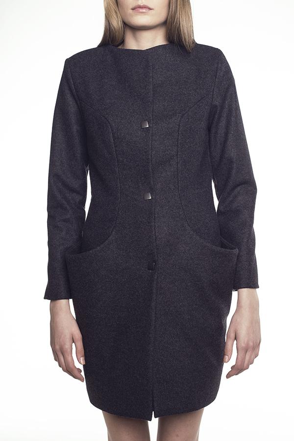 Płaszcz wełniany z bardzo wysokiej jakości wełny. Taliowany z bocznymi usztywnianymi kieszeniami, które formują sylwetkę. Długość przed kolano (w zależności od wzrostu). W wersji kolorystycznej grafit lub brąz. Zapiany na trzy napy. Z satynową chabrową podszewką. Ubranie zostało wyprodukowane w Polsce w sposób odpowiedzialny społecznie i zgodny z zasadami etycznej mody. Skład: wełna 81%, poliester 19%. Produkt do prania chemicznego w pralni.Czas oczekiwania na płaszcz: do 9 dni.