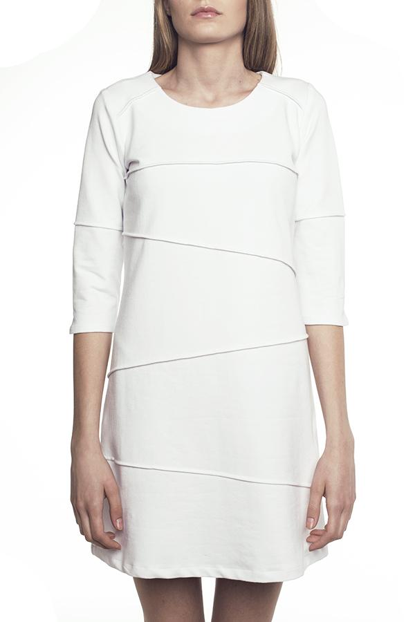 Sukienka Pasy z rękawem 3/4 za łokieć, w kolorach biały, szary melanż, jeans, długość do kolana (zależy od wzrostu), lekko rozszerzana ku dołowi, kryje niedoskonałości figury. Sukienka jest wykonana z wysokiej jakości dzianiny. Ubranie zostało wyprodukowane w Polsce w sposób odpowiedzialny społecznie i zgodny z zasadami etycznej mody. Skład: 96% bawełna, 4% elastan (pranie w pralce 30st.)
