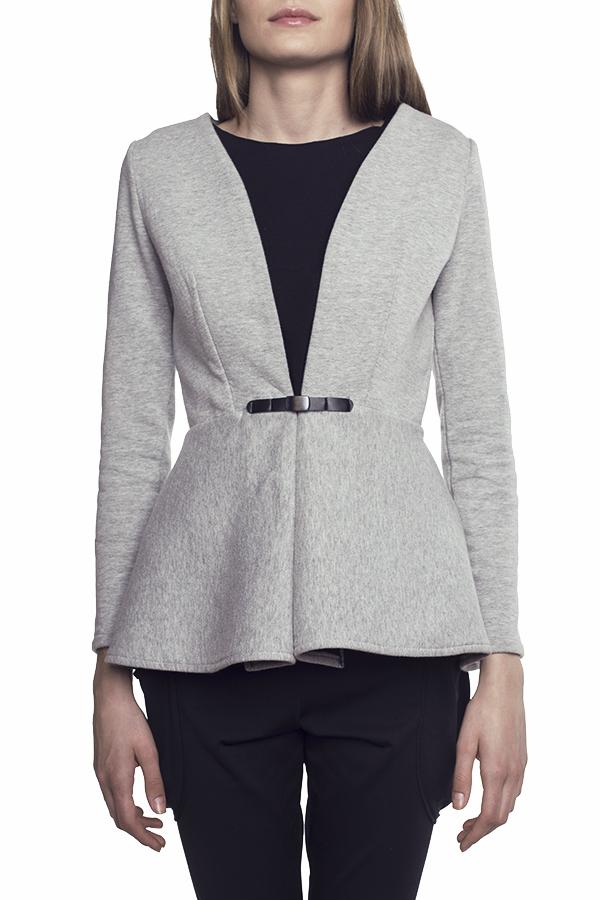 Żakiet koło w kolorze szary melanż, grafitowy melanż i czarny z baskinkowym, usztywnianym dołem i satynową podszewką w kolorze chabrowym. Bardzo kobiecy krój, w wersji rozpiętej ma bardziej sportowy charakter. Ubranie zostało wyprodukowane w Polsce w sposób odpowiedzialny społecznie i zgodny z zasadami etycznej mody.Skład: 90% bawełna, 10% poliester Produkt do prania ręcznego.