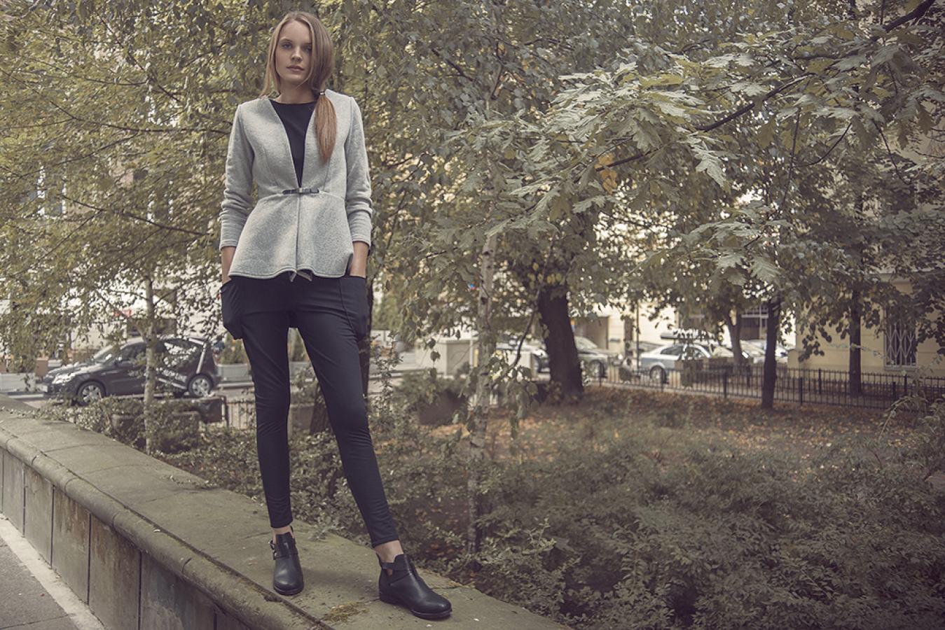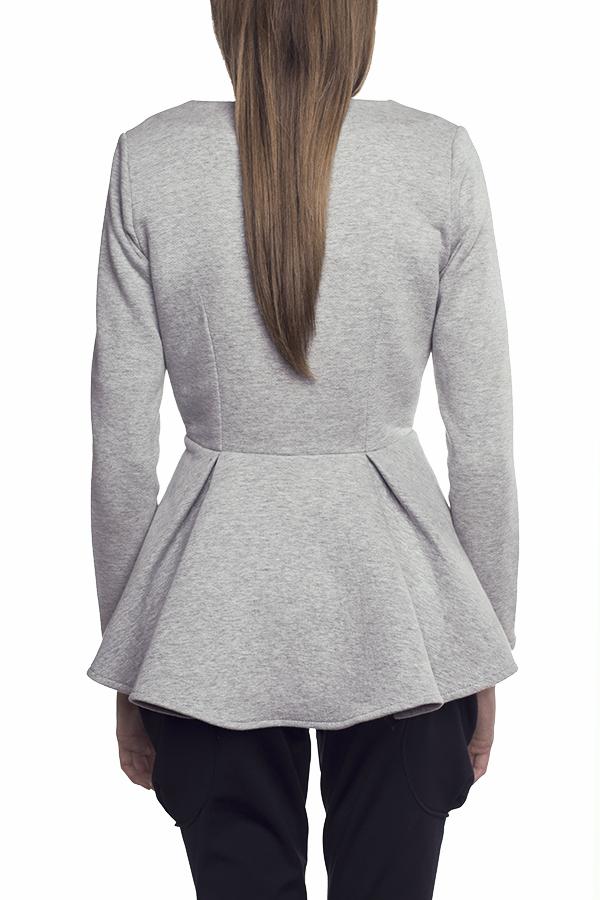 Żakiet koło w kolorze szary melanż, grafitowy melanż i czarny z baskinkowym, usztywnianym dołem i satynową podszewką w kolorze chabrowym. Bardzo kobiecy krój, w wersji rozpiętej ma bardziej sportowy charakter. Ubranie zostało wyprodukowane w Polsce w sposób odpowiedzialny społecznie i zgodny z zasadami etycznej mody.Skład: 90% bawełna, 10% poliester Produkt do prania ręcznego.